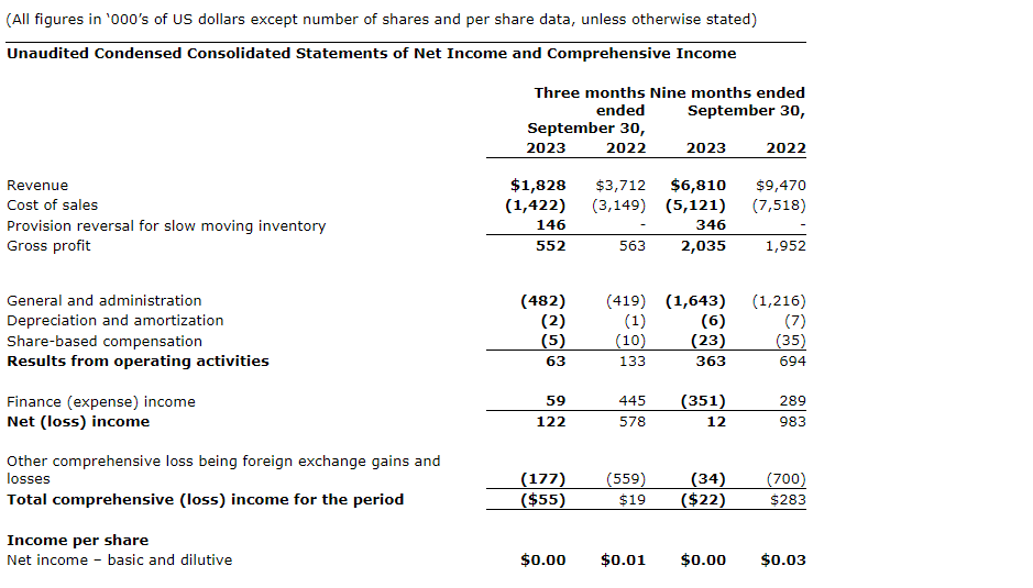Select financial information for the three and nine months ended Sept. 30, 2023, have been summarized herein. The attached table contains results for 2023 and 2022. Refer to the company's audited condensed consolidated financial statements and related management's discussion and analysis (MD&A) for a full description.