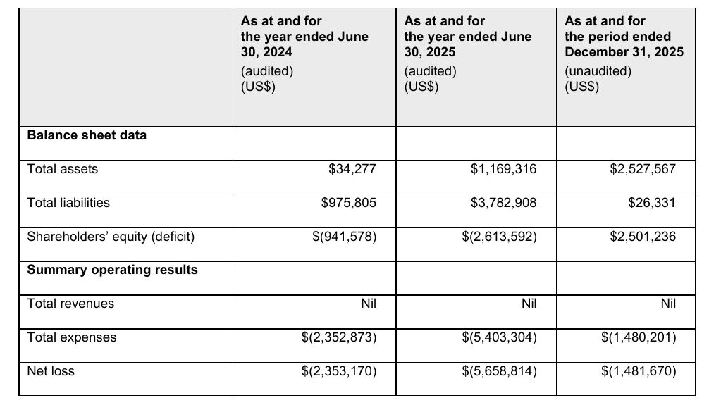 Summary of financial information of Toro Silver