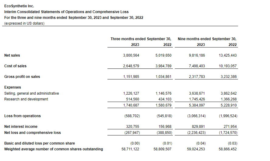 EcoSynthetix Inc. today released its financial and operational results for the three months (Q3 2023) and nine months (YTD 2023) ended Sept. 30, 2023. Financial references are in United States dollars unless otherwise indicated.