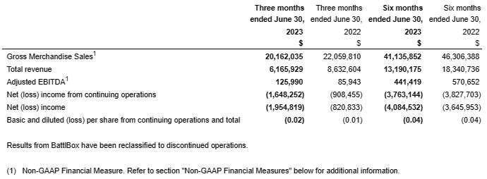 Q2 gross merchandise sales (1) was $20.2-million compared with $22.1-million in Q2 2022. GMS for Q2 2022 would have been $20.6-million when excluding GMS from U.S. operations and trading that were eliminated in 2022;