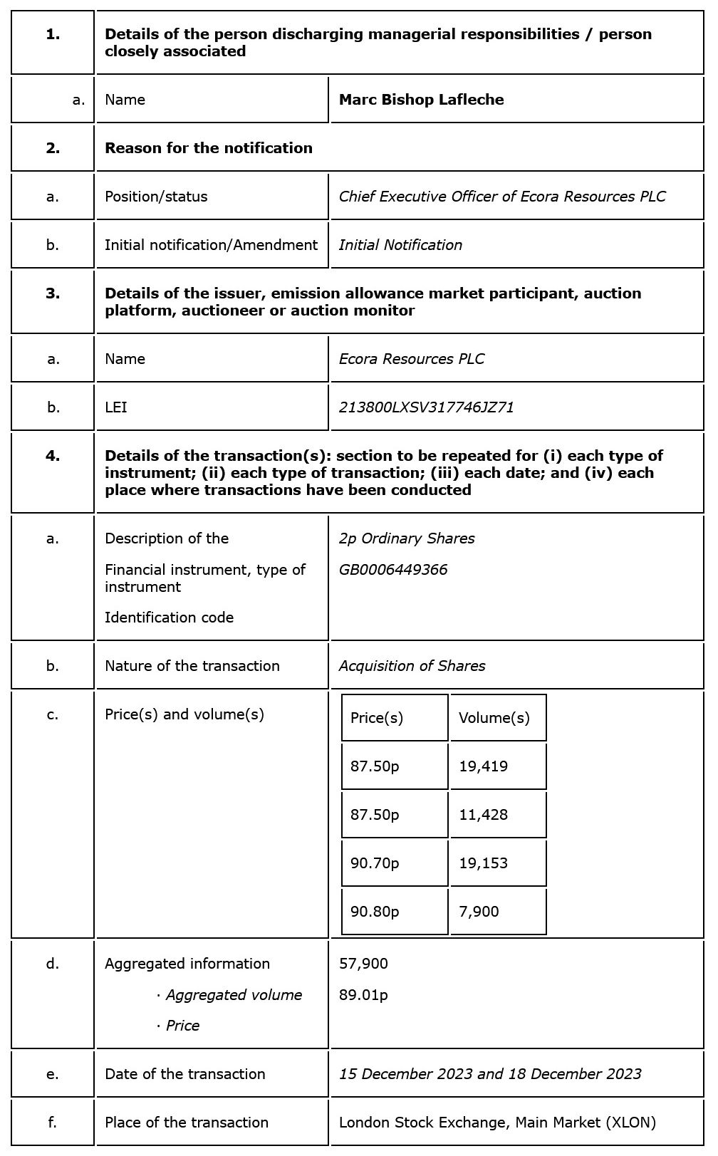 Ecora Resources PLC has received notification of the following transactions by Marc Bishop Lafleche, chief executive officer of the company.