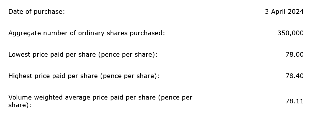 Following the purchase, the company will have 261,732,553 ordinary shares of two pence each in issue, of which 4,774,152 ordinary shares are held in treasury. Therefore, the total number of ordinary shares carrying voting rights will be 256,958,401.