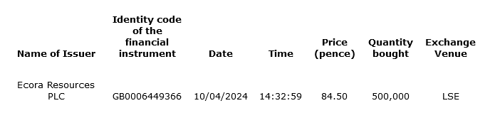On April 10, 2024, Ecora Resources PLC purchased 500,000 ordinary shares of two pence each in the company on the London Stock Exchange through Peel Hunt LLP, in accordance with the terms of its share buyback program announced on March 27, 2024. The shares acquired will be held in treasury.
