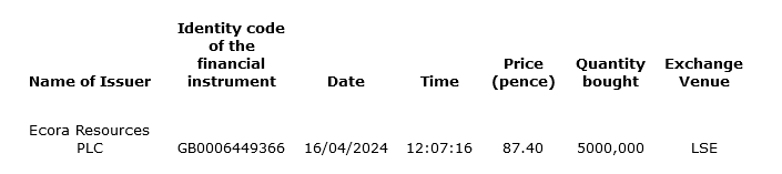 On April 16, 2024, Ecora Resources PLC purchased 500,000 ordinary shares of two pence each in the company on the London Stock Exchange through Peel Hunt LLP, in accordance with the terms of its share buyback program announced on March 27, 2024. The shares acquired will be held in treasury.