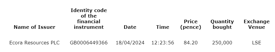 On April 18, 2024, Ecora Resources PLC purchased 250,000 ordinary shares of two pence each in the company on the London Stock Exchange through Peel Hunt LLP, in accordance with the terms of its share buyback program announced on March 27, 2024. The shares acquired will be held in treasury.