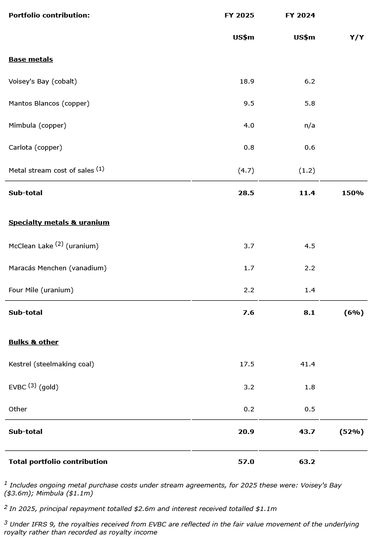 - $57-million portfolio contribution for the year ended Dec. 31, 2025 (2024: $63.2-million), with significant increase in contribution from base metals royalties largely offsetting reduction in Kestrel steelmaking coal contribution;