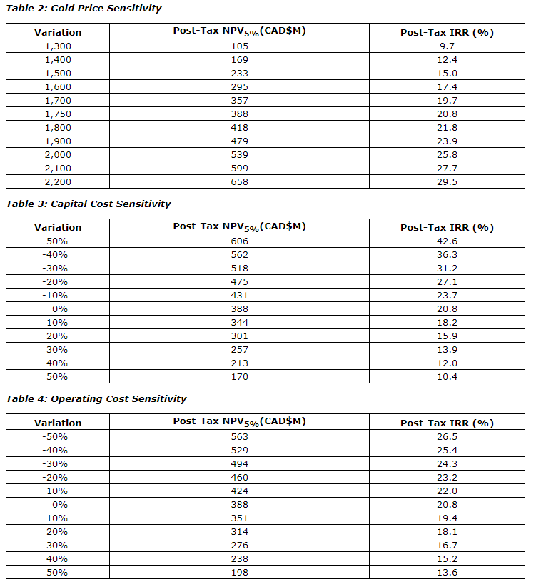 Sensitivity analysis was performed to see the impact on posttax 5-per-cent NPV and posttax IRR by variating the gold price, operating costs and capital costs.