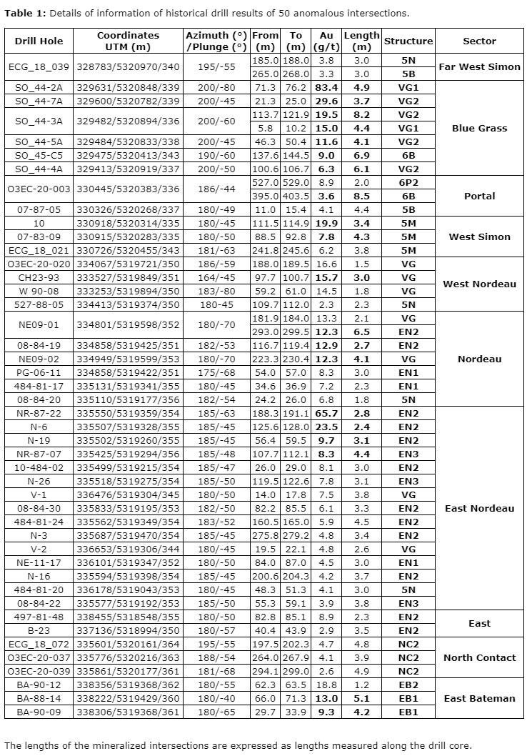 ), representing only 25% of the favorable strike length, are hosted within 19 gold-bearing structures. To date, the favorable Gold Strike hosts 50 anomalous drill hole intersections (Table 1) within 14 gold-bearing structures of which 8 have not yet been explored by Cartier. The majority of the drilling targets is located between the surface and a depth of 200 m.