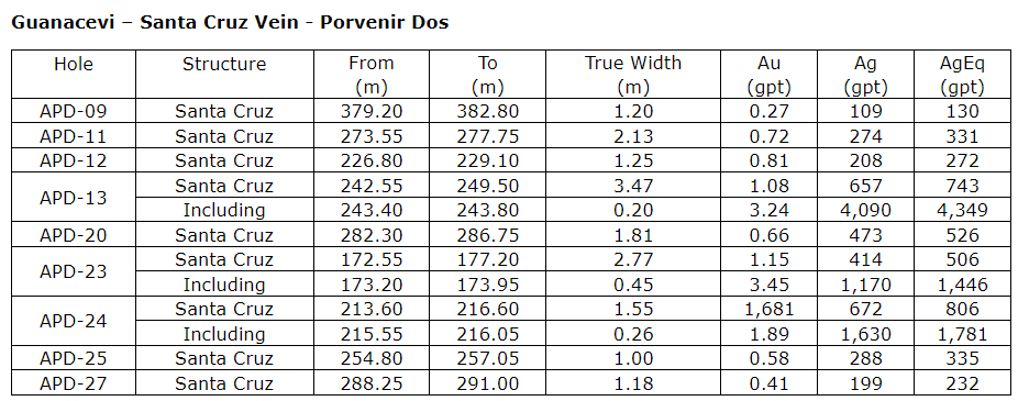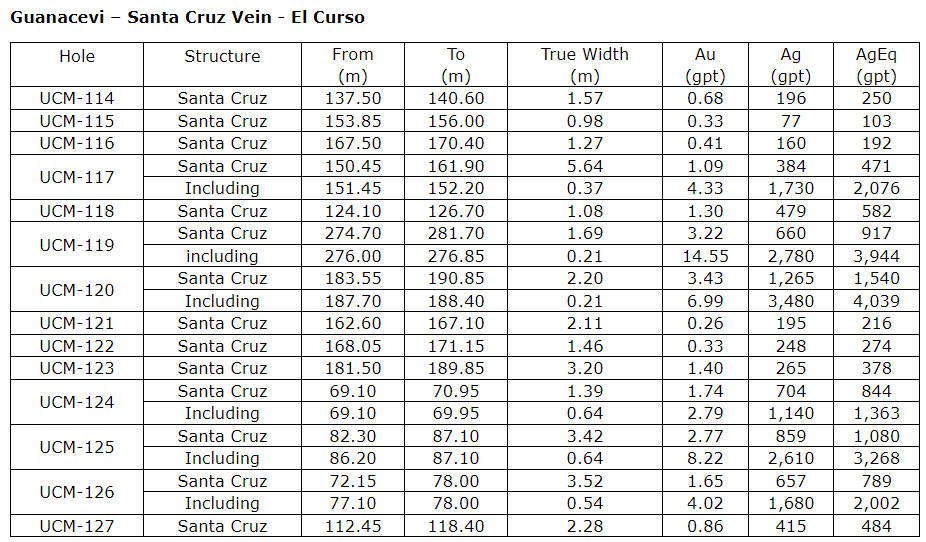 "These encouraging drill results expand our knowledge as we continue to push the boundaries of the mineralized horizons along the Santa Cruz vein. Given the widths and grades of the intersections near existing development, this work is expected continue Guanacevi's history of growth and reserve replacement," stated Dan Dickson, chief executive officer. "We've been mining in this area for nearly 20 years, and the prolific Santa Cruz region remains prospective and is expected to contribute to our strong production profile for years to come."