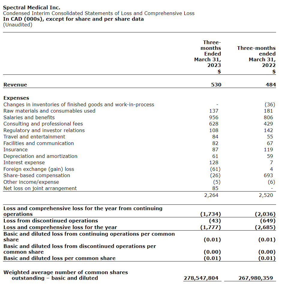 Spectral Medical Inc. has released its financial results for the first quarter ended March 31, 2023, and provided a corporate update.