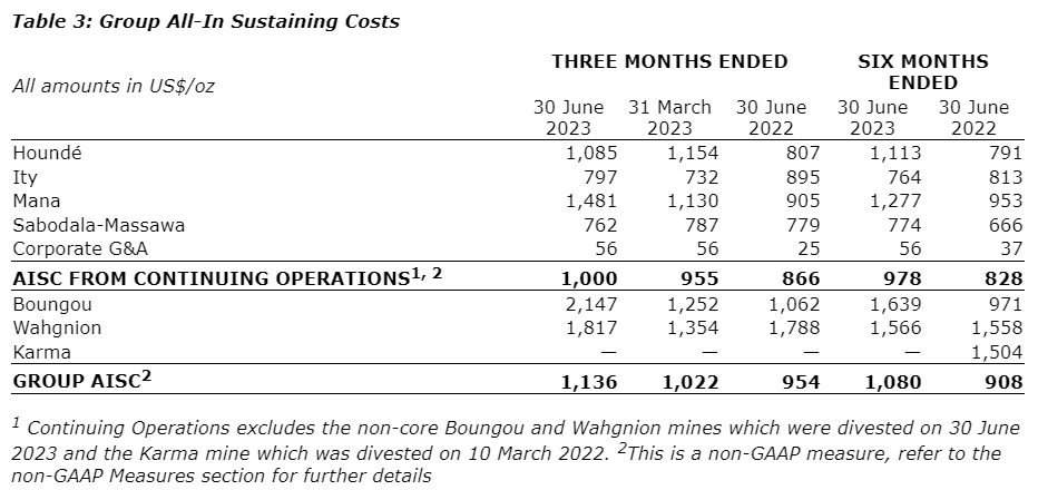 - Q2 2023 production from continuing operations amounted to 268,000 oz, an increase of 24,000 oz, or 10 per cent, over Q1 2023, due to increased production from Hounde and Sabodala-Massawa as higher-grade ore was mined and processed, which was partially offset by a decrease in production at Ity, due to slightly lower grade, throughput and recovery rates, and at Mana due to the increased focus on underground development. Q2 2023 AISC from continuing operations amounted to $1,000/oz, an increase of $45/oz, or 5 per cent, over Q1 2023, due to higher costs at Ity, due to the increased use of self-generated power, and at Mana due to the higher open-pit strip ratio and an increased focus on underground development, which was partially offset by lower costs at Hounde and Sabodala-Massawa.