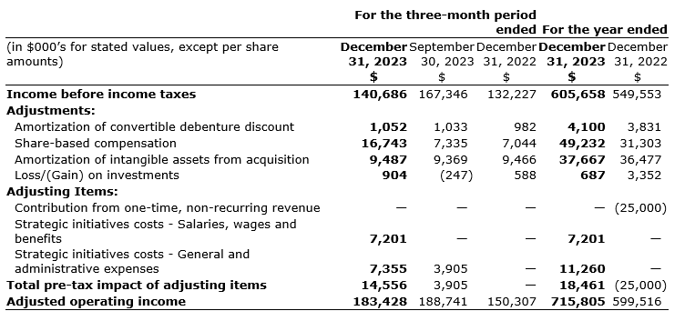 Adjusted operating income reflects net income or loss for the period adjusted for the amortization of debenture discount, share-based compensation, amortization of intangible assets from acquisitions, provision for or recovery of income taxes, loss or income on investments, and adjusting items from an attached table.