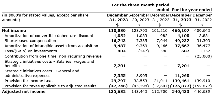 The company's audited consolidated financial statements have been prepared in accordance with IFRS as issued by the IASB (International Accounting Standards Board) and the accounting policies we adopted in accordance with IFRS. These audited consolidated financial statements reflect all adjustments that are, in the opinion of management, necessary to present fairly the company's financial position as at Dec. 31, 2023, and Dec. 31, 2022, the results of operations, comprehensive income and cash flows for the three-month periods and years ended Dec. 31, 2023, and Dec. 31, 2022.