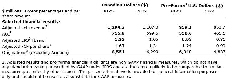 An attached table provides select financial highlights as reported in Canadian dollars alongside select pro forma financial highlights in U.S. dollars for the 12 months ended 2023 and 2022.