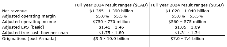 The company reaffirms its previously disclosed 2024 guidance ranges. While the company intends to commence U.S.-dollar reporting in Q1 2024, it re-presents its guidance ranges for 2024 in U.S. dollars. Additionally, the company has provided guidance on origination volume for full year 2024.