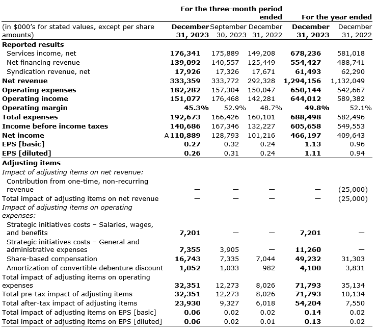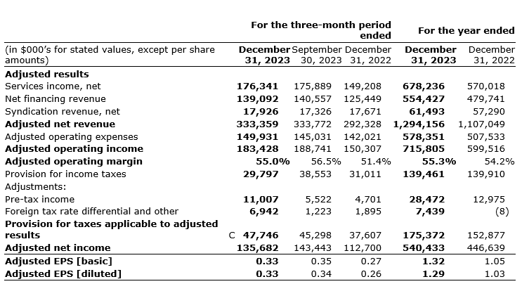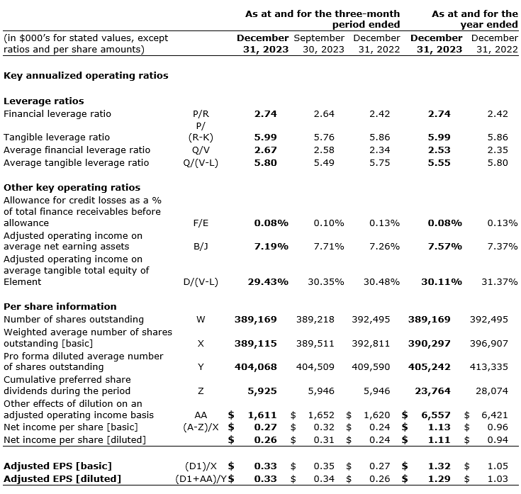 Element Fleet Management Corp. had strong financial and operating results for the three months ended Dec. 31, 2023, and record results for full year 2023.