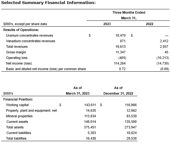 - During the three months ended March 31, 2023, the company realized net income of $114.26-million, or 72 cents per share, primarily due to: (i) a net gain of $116.45-million on the sale of the company's Alta Mesa in situ recovery (ISR) project in Texas; (ii) a net gain of $10.76-million on the sale of 300,000 pounds of uranium (U3O8) to the U.S. uranium program; (iii) a net gain of $320,000 on the sale of 79,344 pounds of vanadium (V2O5); (iv) increased expenses associated with preparing four of the company's uranium mines for production; (v) expenses associated with developing commercial rare earth element (REE) separation capabilities; and (vi) a non-cash mark-to-market loss on investments accounted for at fair value of $2.96-million.
