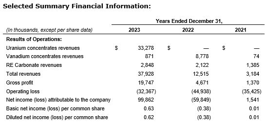 Energy Fuels Inc. has released its financial results for the year ended Dec. 31, 2023. The company's annual report on Form 10-K has been filed with the U.S. Securities and Exchange Commission and may be viewed on EDGAR, on SEDAR+ and on the company's website. Unless noted otherwise, all dollar amounts are in U.S. dollars.