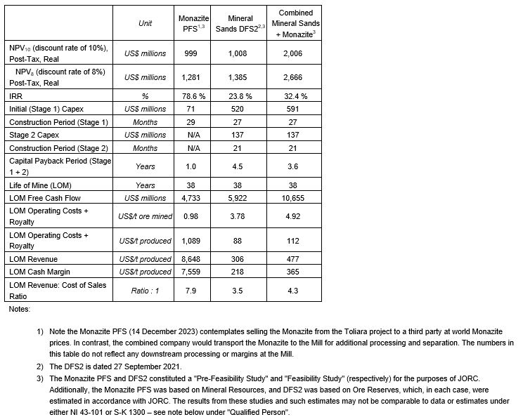(3) The financial information relating to the Ranobe deposit's mineral sands is based on the definitive feasibility study prepared on Sept. 27, 2021. This study constituted a feasibility study for the purposes of the Australasian Code for Reporting of Exploration Results, Mineral Resources and Ore Reserves, 2012 edition (JORC), and the ore reserves underpinning this study were estimated in accordance with JORC. The results from this study and the estimated ore reserves may not be comparable with (as the case may be) data or estimates under either NI 43-101 or S-K 1300.