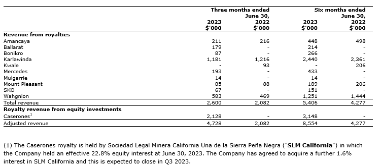An attached table summarizes the company's revenue from royalty interests during the three and six months ended June 30, 2023, and June 30, 2022. Adjusted revenue also includes accrued royalty revenue from equity investments for the same periods (see non-IFRS (international financial reporting standards) measures).