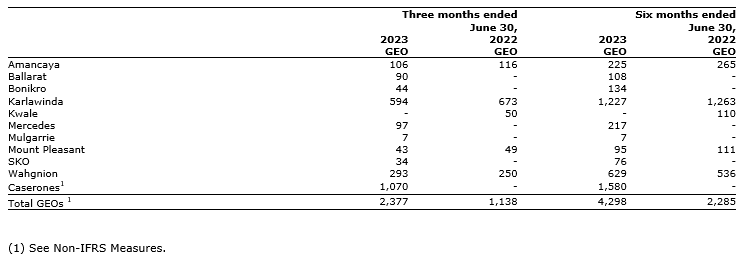 - Record gold equivalent ounces (GEOs) of 2,377 ounces, up 109 per cent compared with Q2 2022;