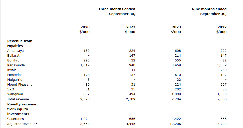 The attached table summarizes the company's revenue from royalty interests during the three and nine months ended Sept. 30, 2023, and 2022. Adjusted revenue also includes accrued royalty revenue from equity investments for the same periods.