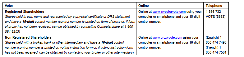 Shareholders are encouraged to vote well in advance of the meeting in accordance with the instructions on their form of proxy or voting instruction form. If you have received a form of proxy or voting instruction form, you are encouraged to vote in accordance with the instructions contained therein.