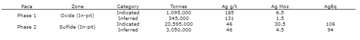 The Paca project hosts an indicated resource of 6.5 million oz of silver (1,095,000 tonnes grading 185 g/t Ag) in oxide form near surface estimated by Mercator in a NI43-101 technical report dated October 20, 2020.