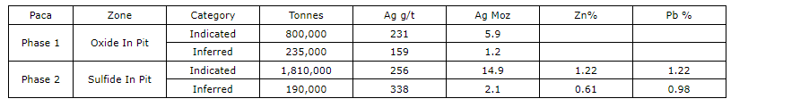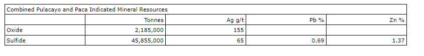Combined indicated mineral resources includes Pulacayo pit-constrained and out-of-pit plus only Paca pit-constrained resources. Oxide resources use a 50 g/t Ag cut-off. Sulphide resources use a 100 g/t Ag Eq cut-off. AgEq equals silver equivalent (recovered) equals (Ag g/t multiplied by 89.2 per cent) plus ((Pb per cent multiplied by (95 U.S. cents/lb Pb/14.583 Troy oz/lb/$17 (U.S.) per Troy oz Ag) multiplied by (10,000 multiplied by 91.9 per cent)) plus ((Zn per cent multiplied by ($1.16 (U.S.)/lb Zn/14.583 Troy oz/lb/$17 (U.S.) per Troy oz Ag) multiplied by (10,000 multiplied by 82.9 per cent)). Sulphide zone metal recoveries of 89.2 per cent for Ag, 91.9 per cent for Pb and 82.9 per cent for Zn were used in the silver equivalent (recovered) equation and reflect metallurgical testing results disclosed previously for the Pulacayo deposit. Matthew Harrington, PGeo, is the independent qualified person for the resource estimate.