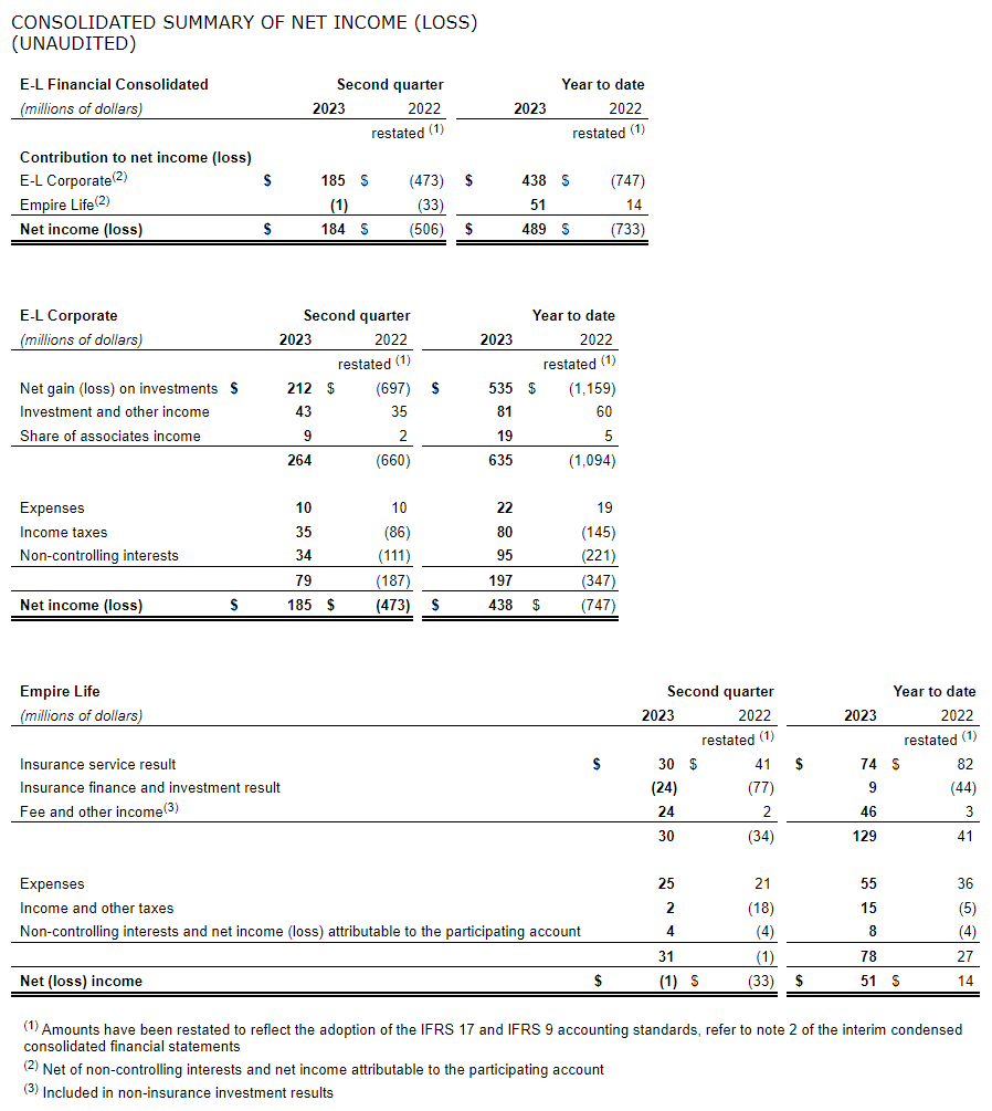 For the second quarter ended June 30, 2023, E-L Financial reported a consolidated net income of $184-million, or $52.07 per common share, compared with a net loss of $506-million, or $142.50 per common share, for the same period in 2022. For the first six months ended June 30, 2023, E-L Financial reported a consolidated net income of $489-million, or $139.08 per common share, compared with a net loss of $733-million, or $206.24 per common share, for the same period in 2022.