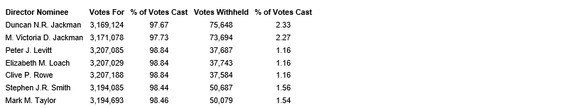 By a vote conducted by poll, the seven nominees set forth in the circular were elected as directors of the company. The specific voting results are provided in an attached table.