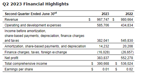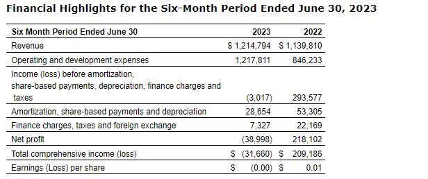 - Income before amortization, share-based payments, depreciation, finance charges and taxes was $382,041 in Q2 2023 compared with the income of $545,830 in Q2 2022.