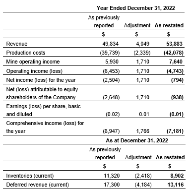In connection with the preparation of the company's consolidated financial statements for the year ended Dec. 31, 2023, an error was identified in the recognition of revenue related to a chrome concentrate sales transaction in the fourth quarter of 2022, which impacts the company's previously filed audited consolidated financial statements for the year ended Dec. 31, 2022, and its unaudited interim consolidated financial statements for the three months ended March 31, 2023. Chrome concentrate revenue is recognized when control is transferred to the buyer and payment is considered probable. A sales transaction that was included in deferred revenue at the end of 2022 and recognized as revenue in the first quarter of 2023 should have been recognized in the fourth quarter of 2022 based on the fact that the company had met all of its required performance obligations at the time, as supported by the underlying contract and bill of lading. Previously reported revenue from 2022 was thus understated by $4.0-million, with associated errors in production costs, inventories and deferred revenue.