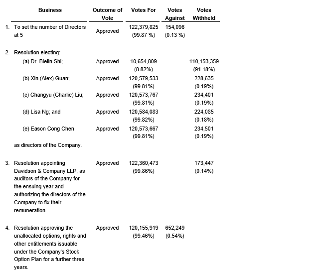However, one director, Dr. Bielin Shi, had more votes withheld than were voted in favour of his appointment to the board. As a result, in accordance with the company's majority voting policy, Dr. Shi has tendered his resignation from the board of directors of the company, effective upon acceptance by the board. The board will refer such resignations to the corporate governance and compensation committee for consideration on whether or not to accept the resignations submitted by Dr. Shi. In accordance with the policy, the board shall accept such resignation unless the committee determines that there are exceptional circumstances relating to the composition of the board or the voting results that should delay the acceptance of such resignation or justify rejecting such resignation. The board will issue a news release with its decision.