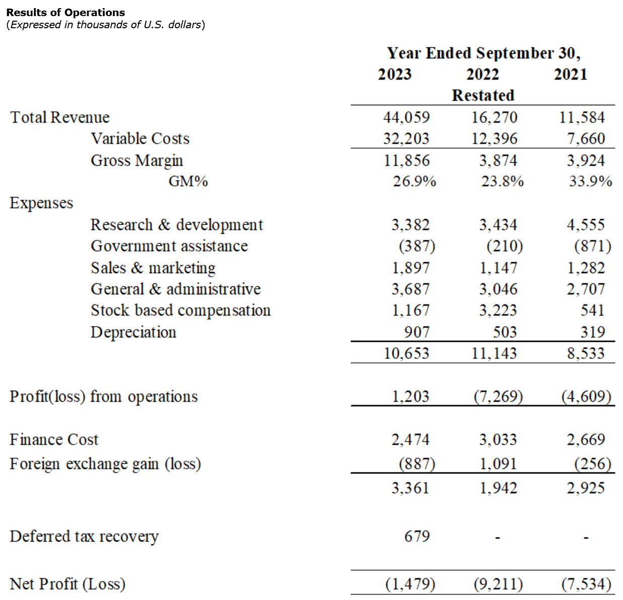 - Revenue for FY 2023 was $44.1-million, compared with restated revenue of $16.3-million in the fiscal year ended Sept. 30, 2022 (FY 2022). The overall gross margin was 27 per cent in FY 2023, which was a 300-basis-point increase from the FY 2022 level.
