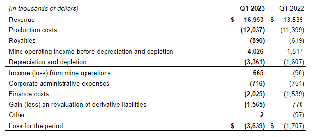 The company generated total revenue of $17-million during the quarter, an increase of 25 per cent compared with the first quarter of 2022, on 8,078 ounces of gold and 71,286 ounces of silver sold. The average realized price of gold per ounce sold for the quarter was $1,906.