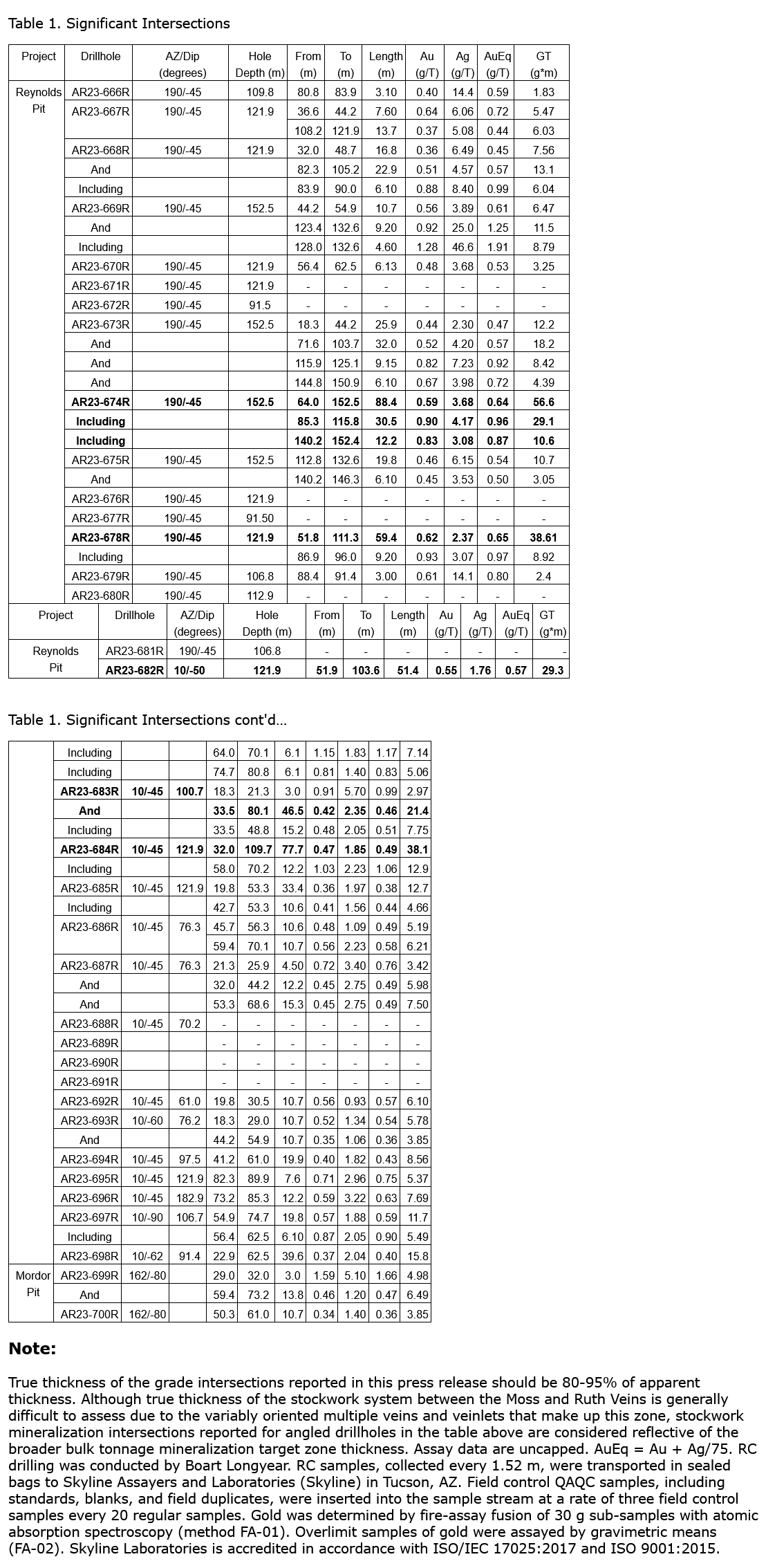 - Hole AR23-674R in the Reynolds Pit area intersected 88.4 meters grading 0.59 g/t Au and 3.68 g/t Ag; Including 54.9 meters grading 0.65 g/t Au and 4.49 g/t Ag.