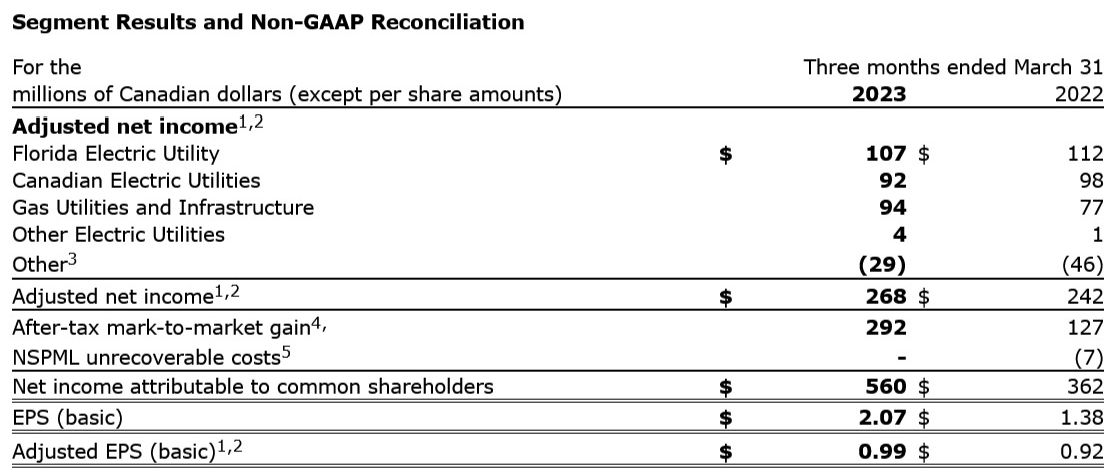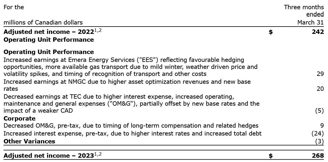 Q1 2023 adjusted net income was $268-million, or 99 cents per common share, compared with $242-million, or 92 cents per common share, in Q1 2022. The increase was primarily due to higher earnings contribution from EES and NMGC; the impact of a weaker Canadian dollar; and decreased corporate costs due to timing of long-term compensation and related hedges. These were partially offset by increased interest expense due to higher interest rates and increased total debt; and lower earnings contributions from TEC.