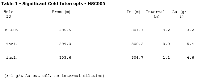 Hole HSC005 is the first to penetrate the northwest-trending Little Humboldt fault and encountered thicker and more intense hydrothermal alteration than the previous three holes. All gold mineralization intersected to date is hosted within the Mississippian Home Ranch terrane, consisting of volcanic rocks with highly varying textures interspersed with lesser limestone. Some of the best host rocks are volcanic breccias with angular clasts.