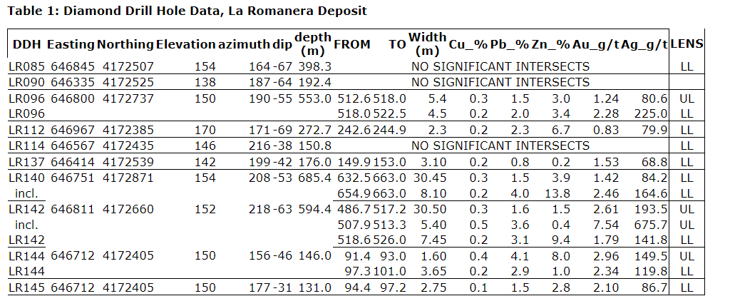 La Romanera assay results include holes LR085, LR090, LR096, LR112, LR114, LR137, LR140, LR142, LR144 and LR145 and are reported below.