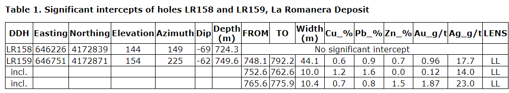 Drilling at La Romanera continues to test the depth extent of the deposit, down plunge to the west-northwest. Assay results reported here are for the recently completed drill holes LR158 and LR159 (see the table entitled "Significant intercepts of holes LR158 and LR159, La Romanera deposit"). The drill holes used for the company's maiden National Instrument 43-101 mineral resource estimate (please see the company's July 6, 2023, press release and technical report under the company's profile on SEDAR+) delineated the deposit to a vertical depth of about 450 metres. Since then, the company has completed 20 additional drill holes (three more in progress), which have extended the deposit approximately an additional 300 m in depth below the resource estimate.