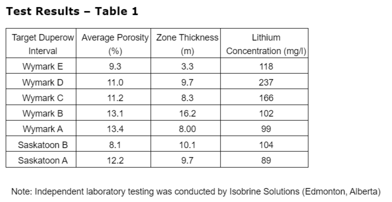 Third party laboratory testing returned lithium concentrations in the Duperow formation of up to 237 milligrams per litre (for detailed test results, refer to the attached table). According to public records, these test results are among the highest lithium concentrations recorded in a brine in Canada to date.