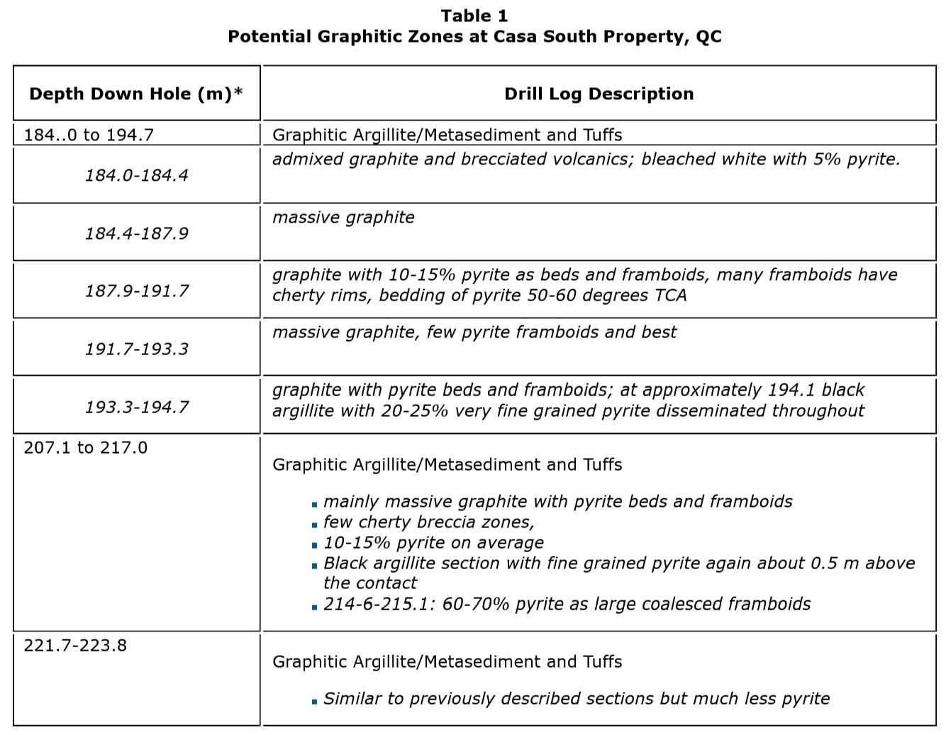 For example, in Assessment Report GM43138 by MPH Consulting Limited, the log for drill hole FK-86-01 describes several zones of graphitic argillite/metasediment and tuff as outlined in Table 1 below. Table 1 includes the following significant intercepts related to graphitic areas: