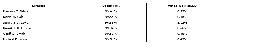 Voting results for all resolutions noted above are reported in the report on voting results as filed under the company's SEDAR+ profile on June 2, 2025.