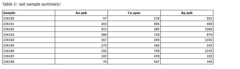 Soil samples were collected from a scree slope buried beneath till and comprise colluvium and fine rocks debris. Samples returned elevated gold and copper values, summarized in Table 1.