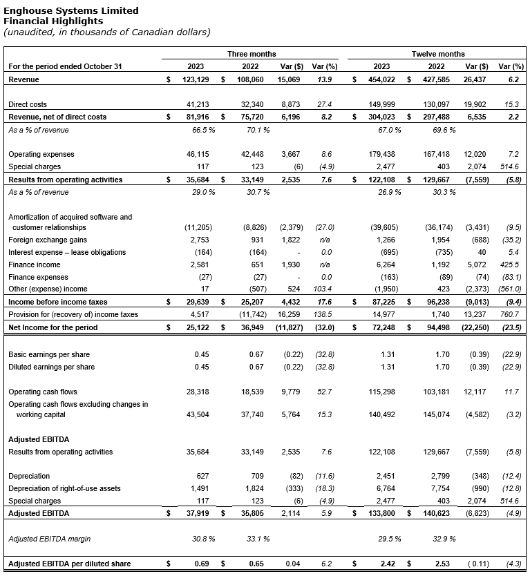 Enghouse Systems Ltd. has released its fourth quarter (unaudited) and year-end financial results for the period ended Oct. 31, 2023. All figures are denominated in Canadian dollars unless otherwise indicated.