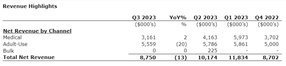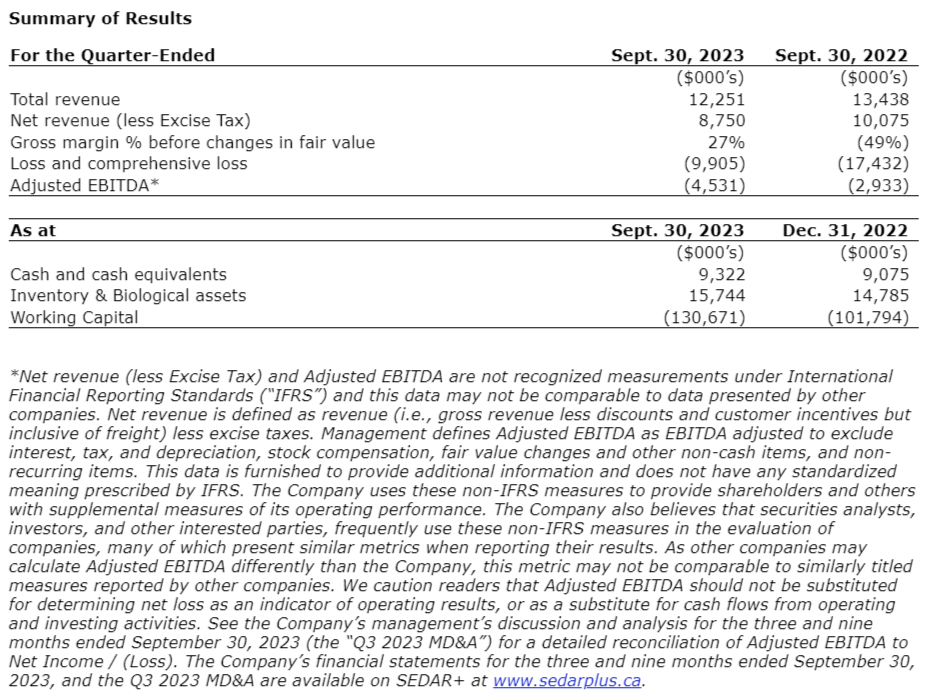 - Gross profit before changes in fair value was $2.4-million for Q3 2023, representing an increase of $7.3-million compared with Q2 2022. This growth can be attributed to a strategic focus on operational efficiencies bolstered by reduced inventory write-downs in Q3 2023.