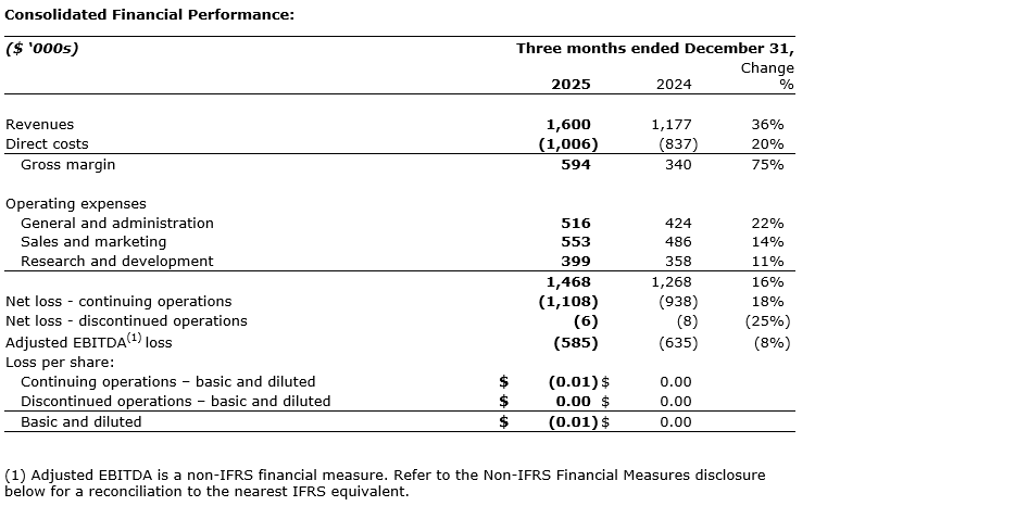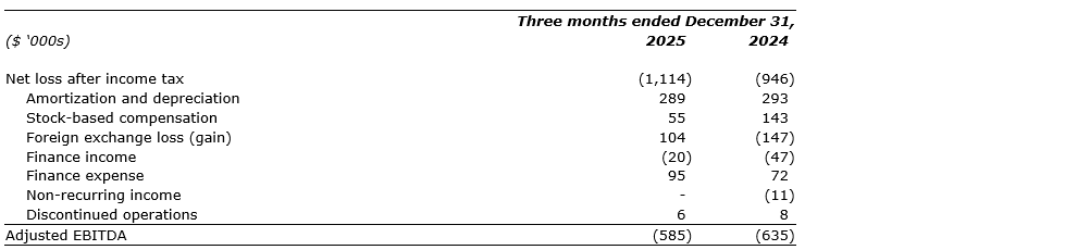 • Reported an adjusted EBITDA (earnings before interest, taxes, depreciation and amortization) (1)) loss of $585 for Q1 2026, an improvement of $50 from the comparable period in the prior year.