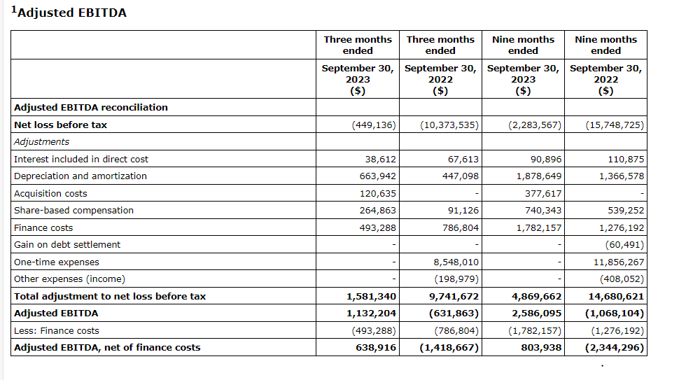 • Positive adjusted EBITDA, net of finance costs of $600,000 for the three months ended Sept. 30, 2023, compared with adjusted EBITDA (loss) of $1.4-million for the same period in 2022, reflecting a $2-million (143-per-cent) increase compared with the same period in 2022.