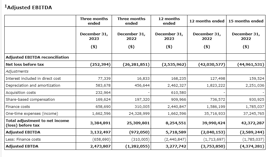 - Positive adjusted EBITDA of $5.7-million for the 12 months ended Dec. 31, 2023, as compared with adjusted EBITDA loss of $2-million for the 12 months period ended Dec. 31, 2022.